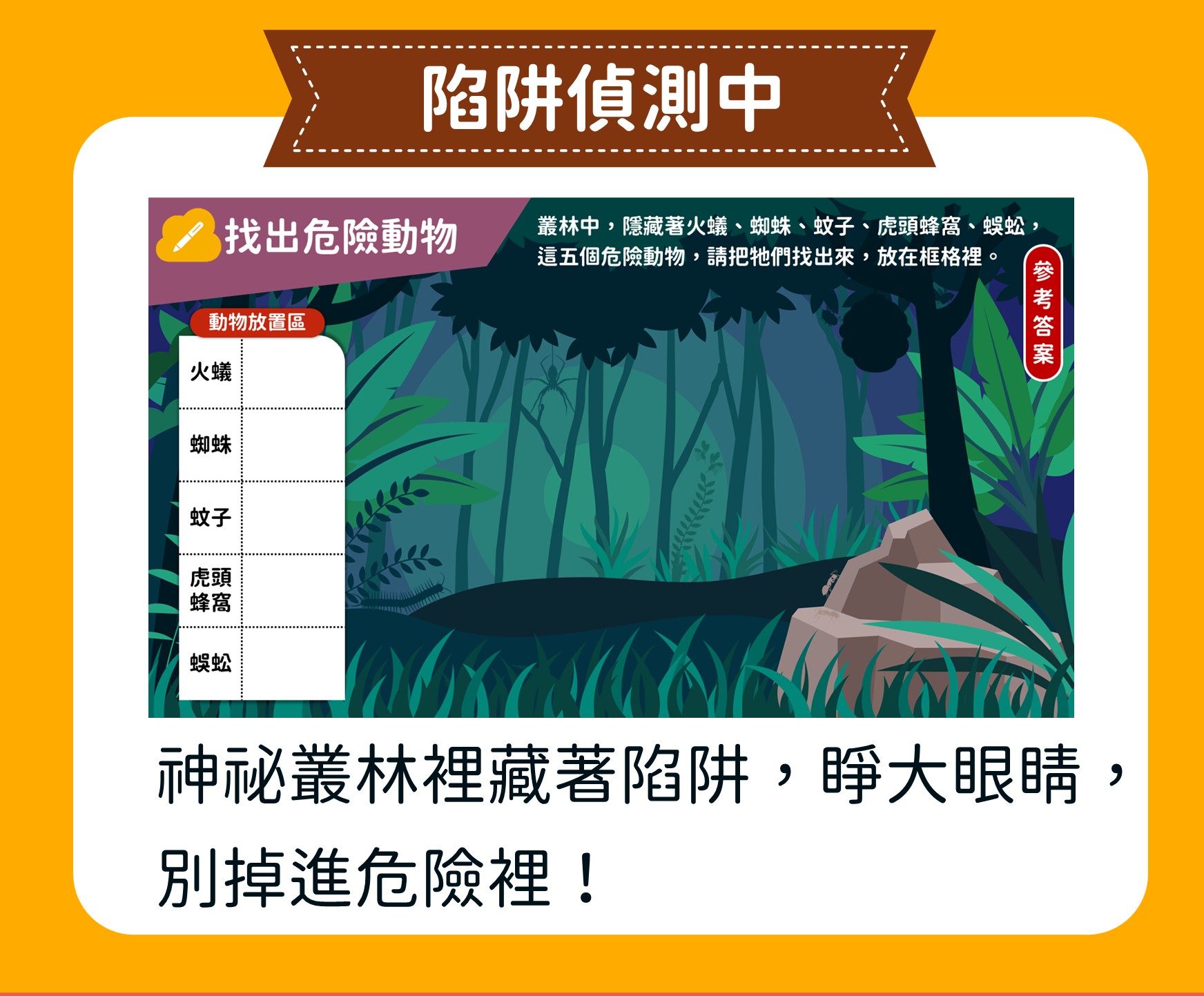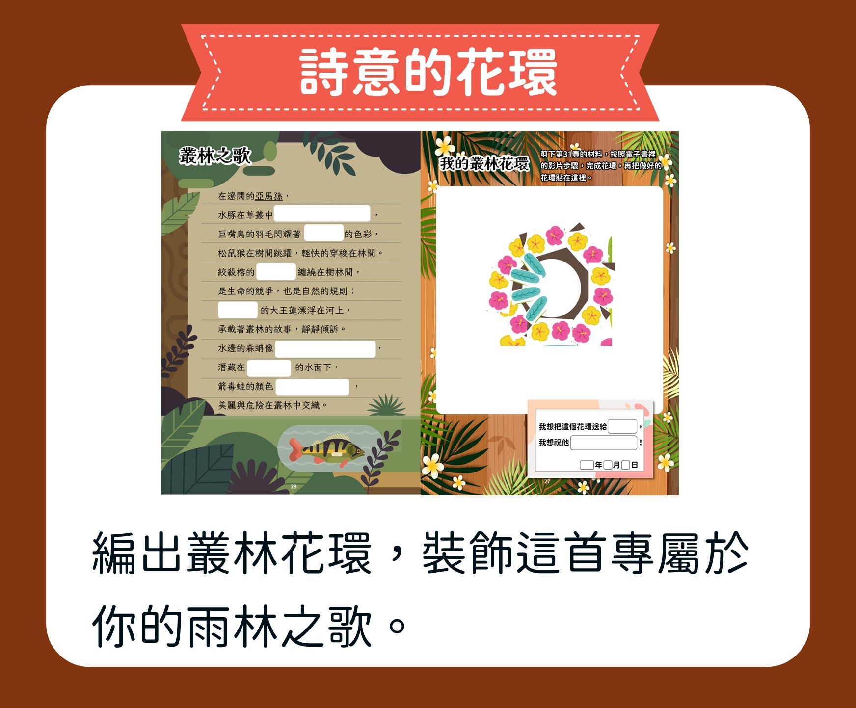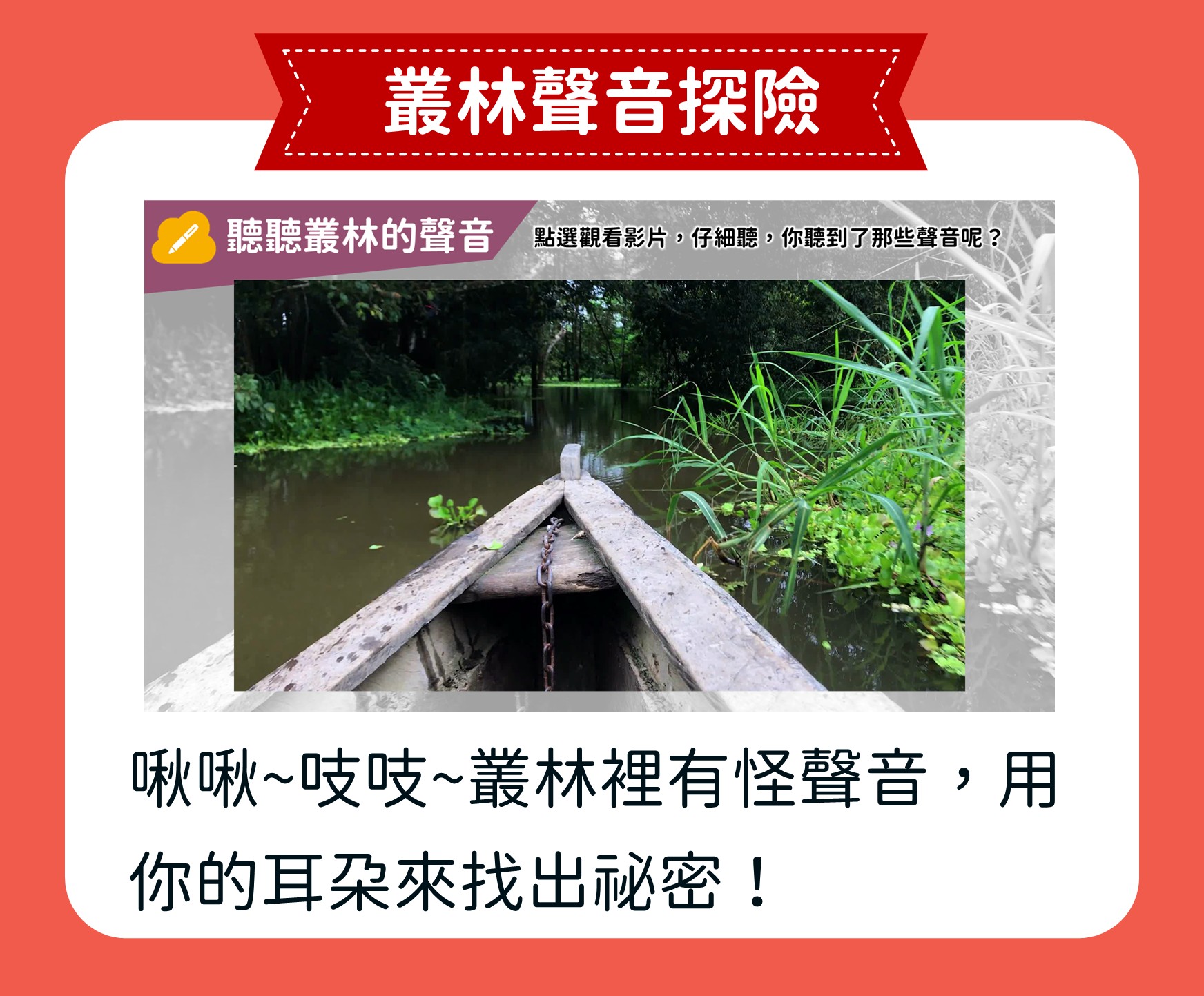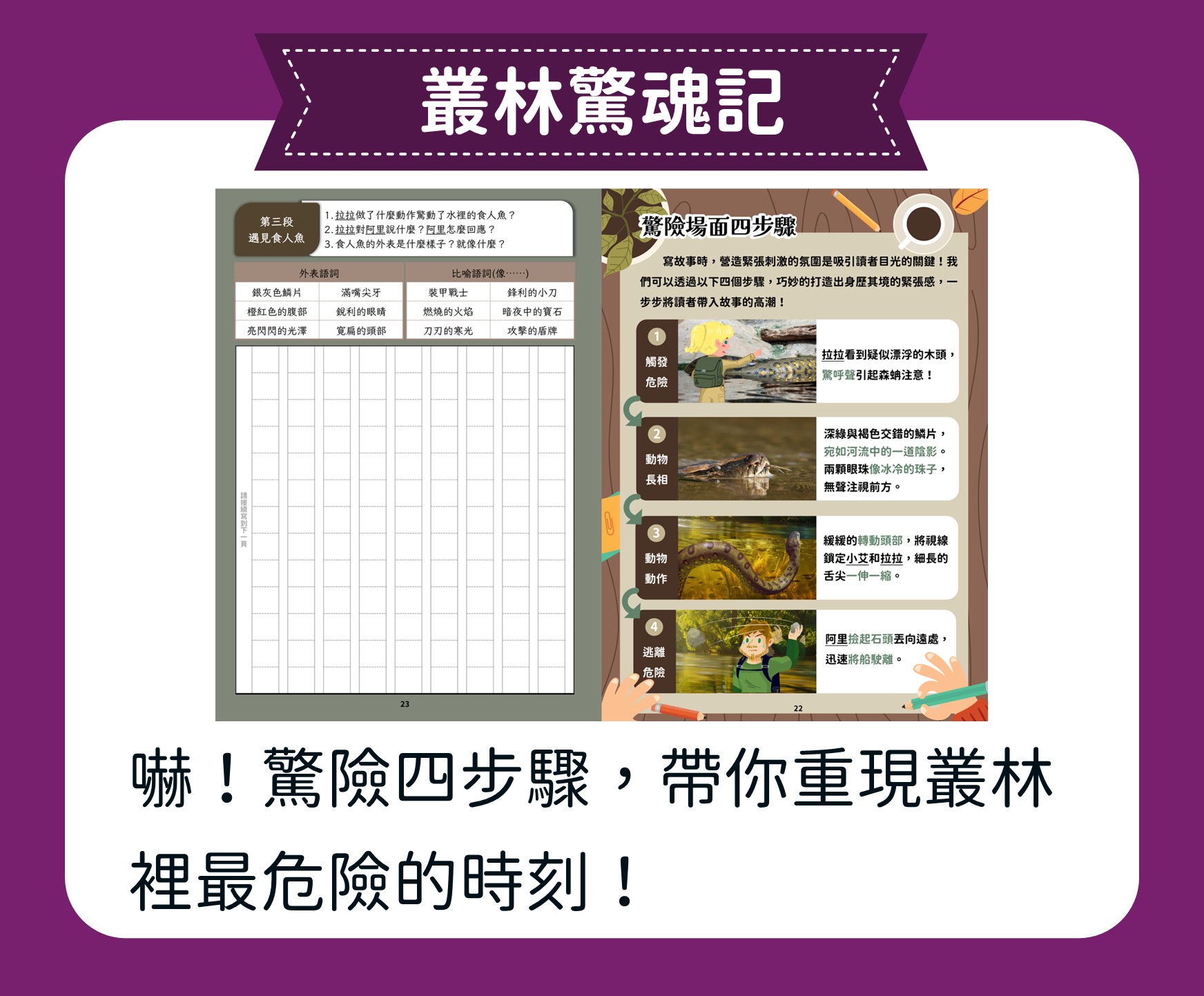 這堂課帶領孩子走進神祕的亞馬遜雨林,從行前準備、植物到動物,逐步探索熱帶雨林。孩子透過閱讀與觀察,捕捉故事中的細節,學習描寫立體的場景,寫出生動的叢林冒險旅程。