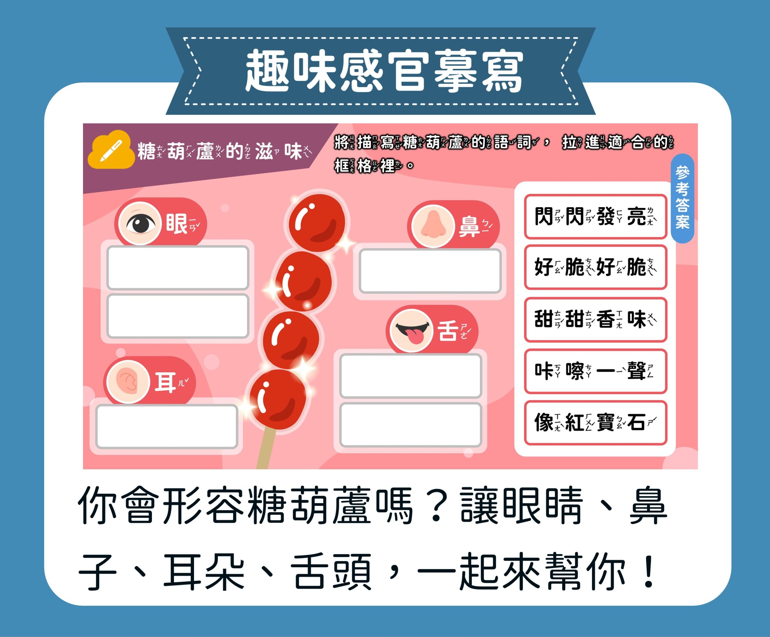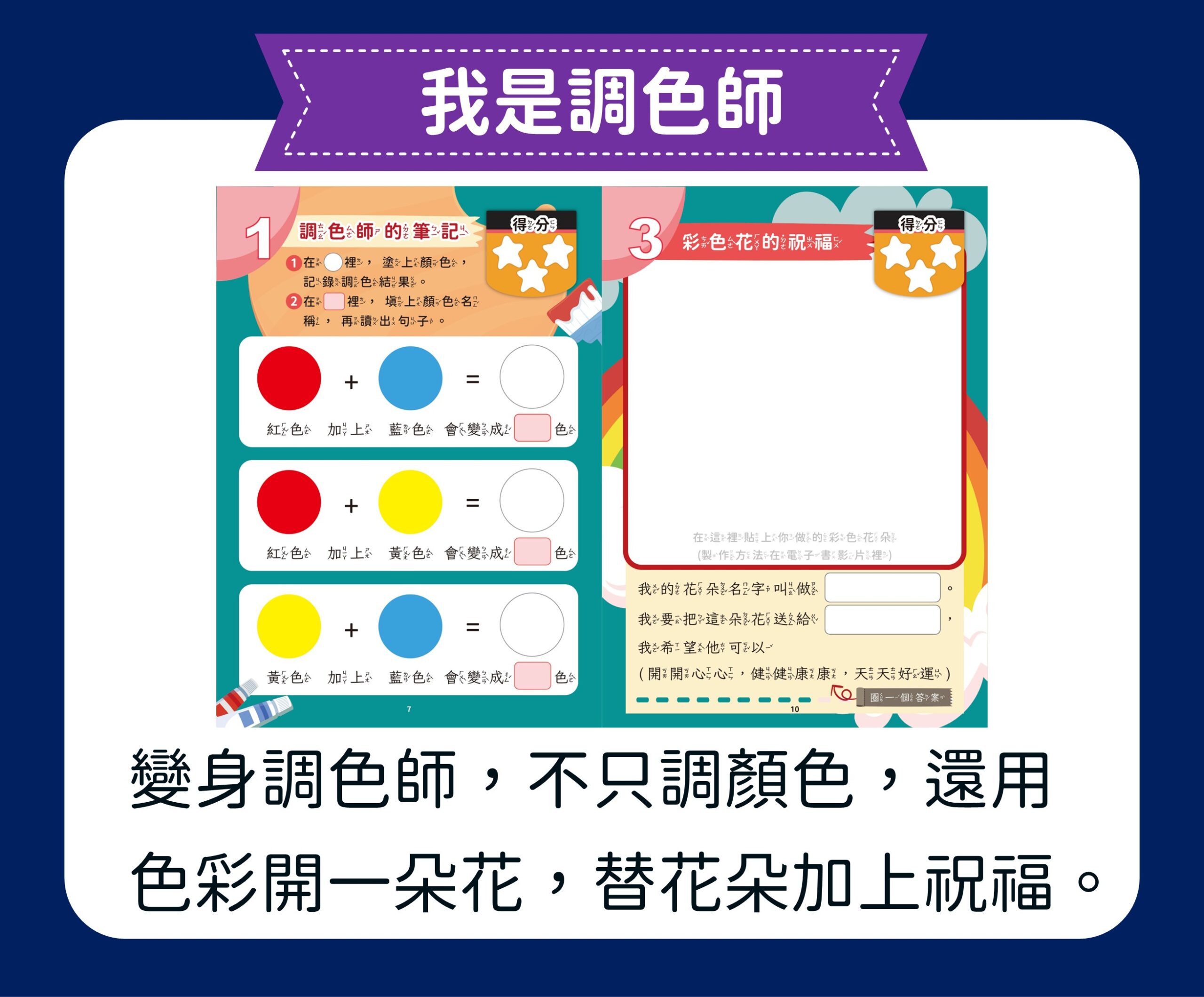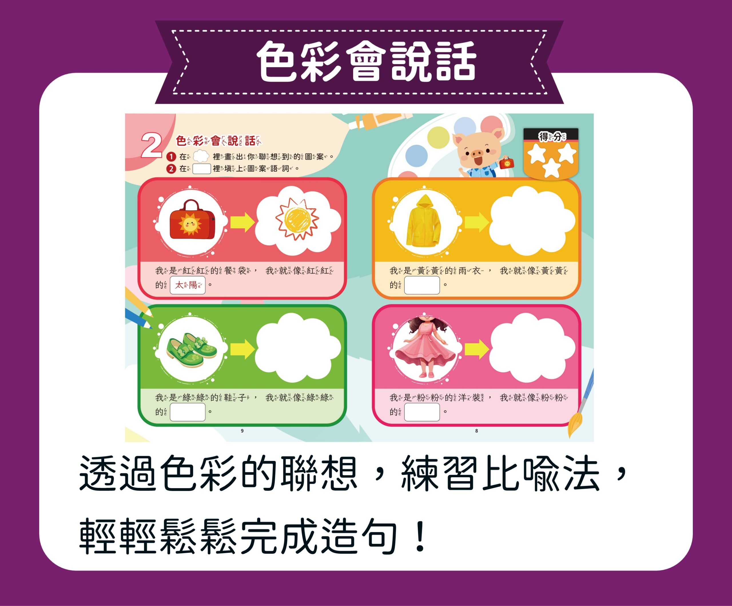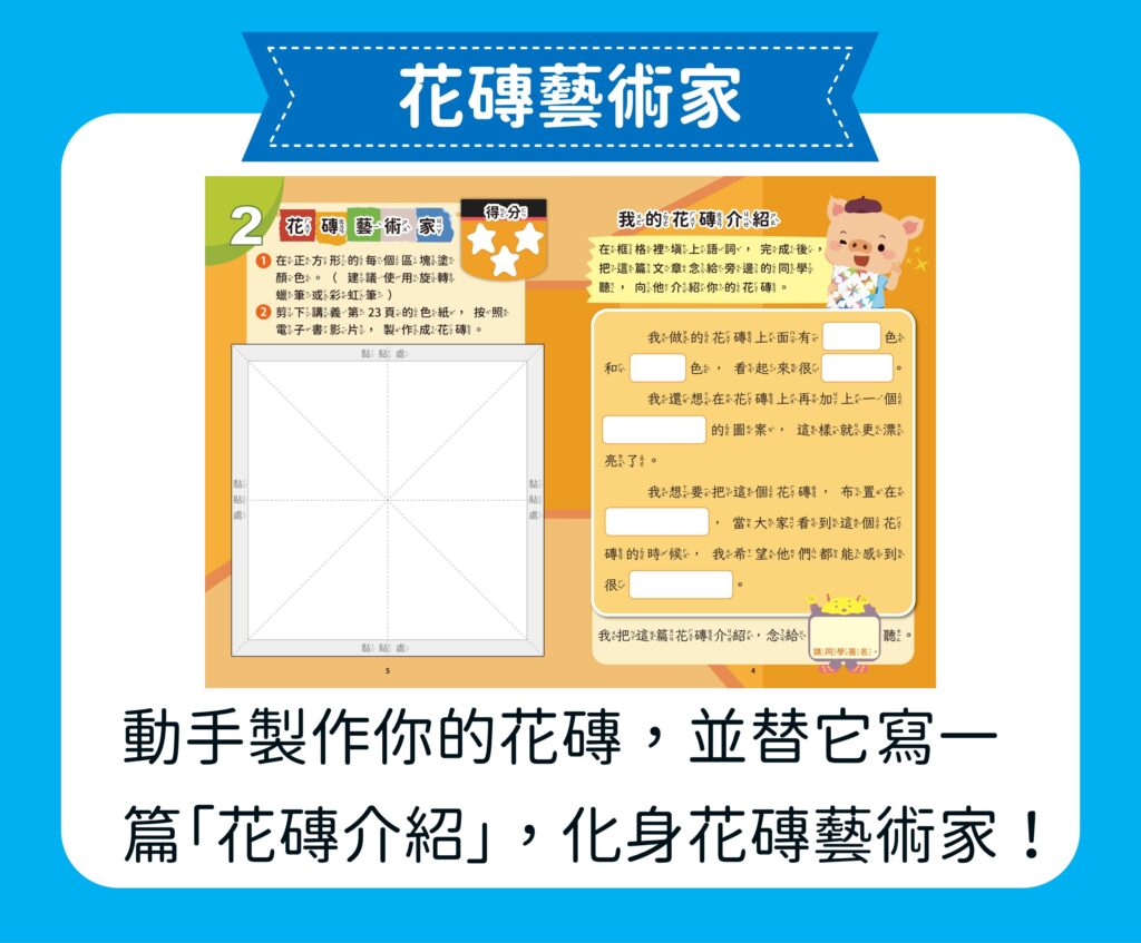 【創意玩出來】單元專為小一新生設計,透過剪貼花磚、玩轉色彩、手作風箏和糖葫蘆等四個動手做的有趣課程 ,讓孩子在玩樂中自由探索 ,同時學習運用感官與句型 ,啟動寫作天賦,建構屬於自己的創意世界。