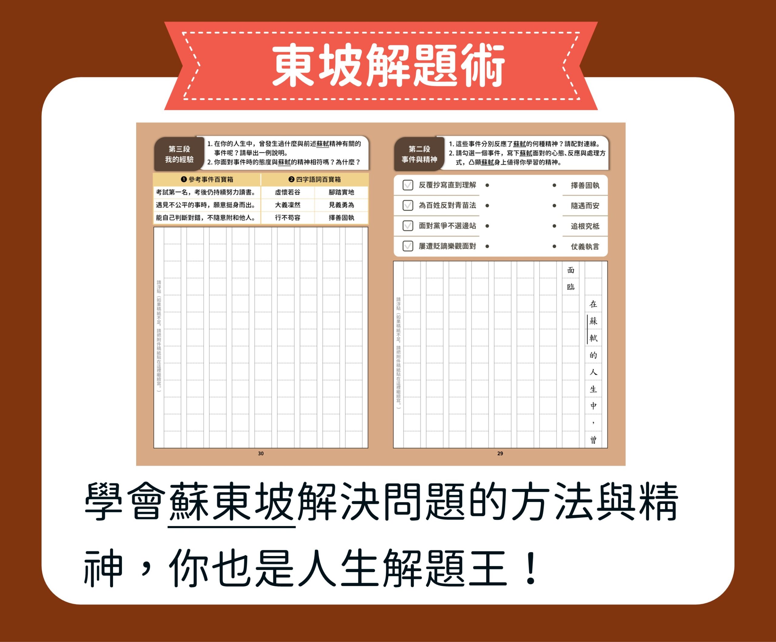 第四堂課「蘇軾教會我的事」:從蘇軾的晚年際遇,引導孩子歸納他面對困境的智慧,並寫下從他身上學到的「精神」。這是一堂淬鍊孩子價值觀與生命韌性的總結。