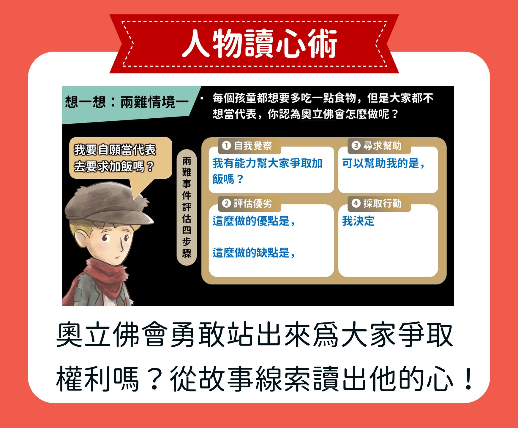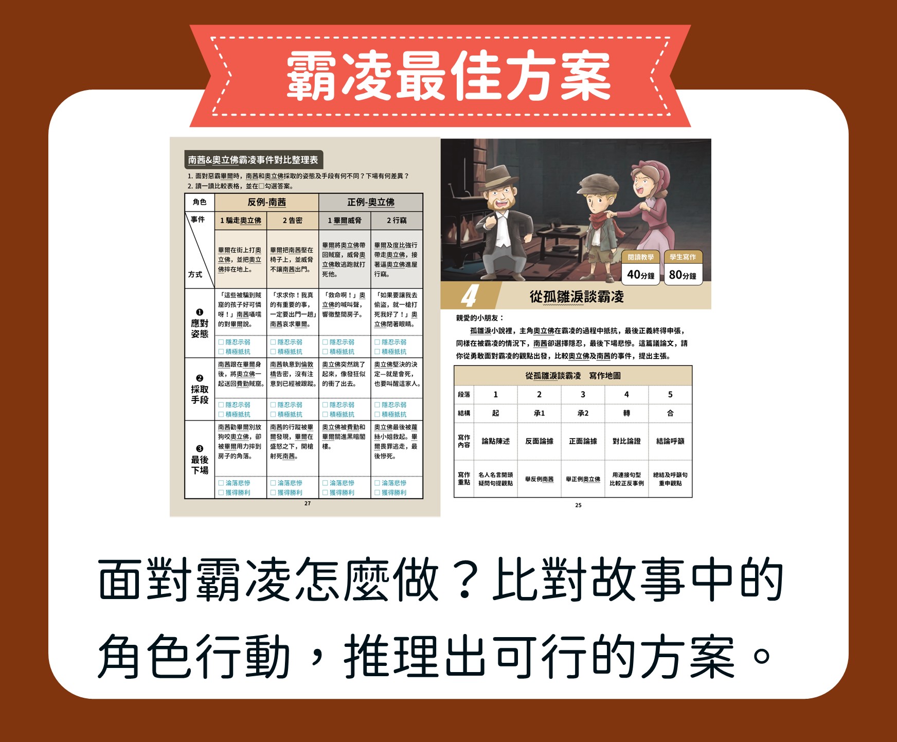 【從經典文學,學會反霸凌的智慧與勇氣】 這堂課我們陪孩子一起閱讀狄更斯的經典作品《孤雛淚》,引導孩子做角色行動分析,理解故事人物所傳達出的意涵。並一起思考面對不當霸凌時,該如何安全應對。最後讓孩子練習正反論據的論說文創作,勇敢表達自己的觀點。