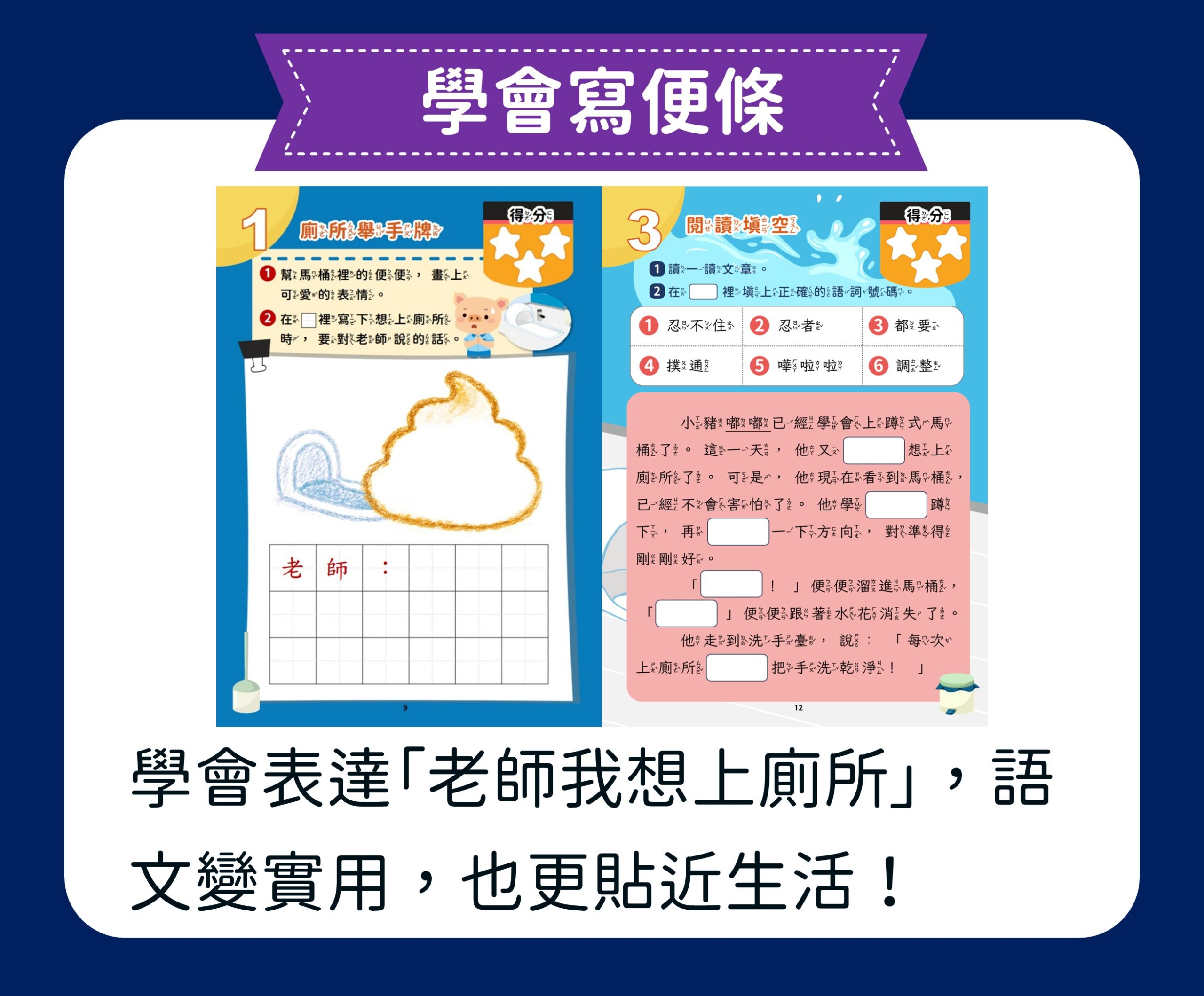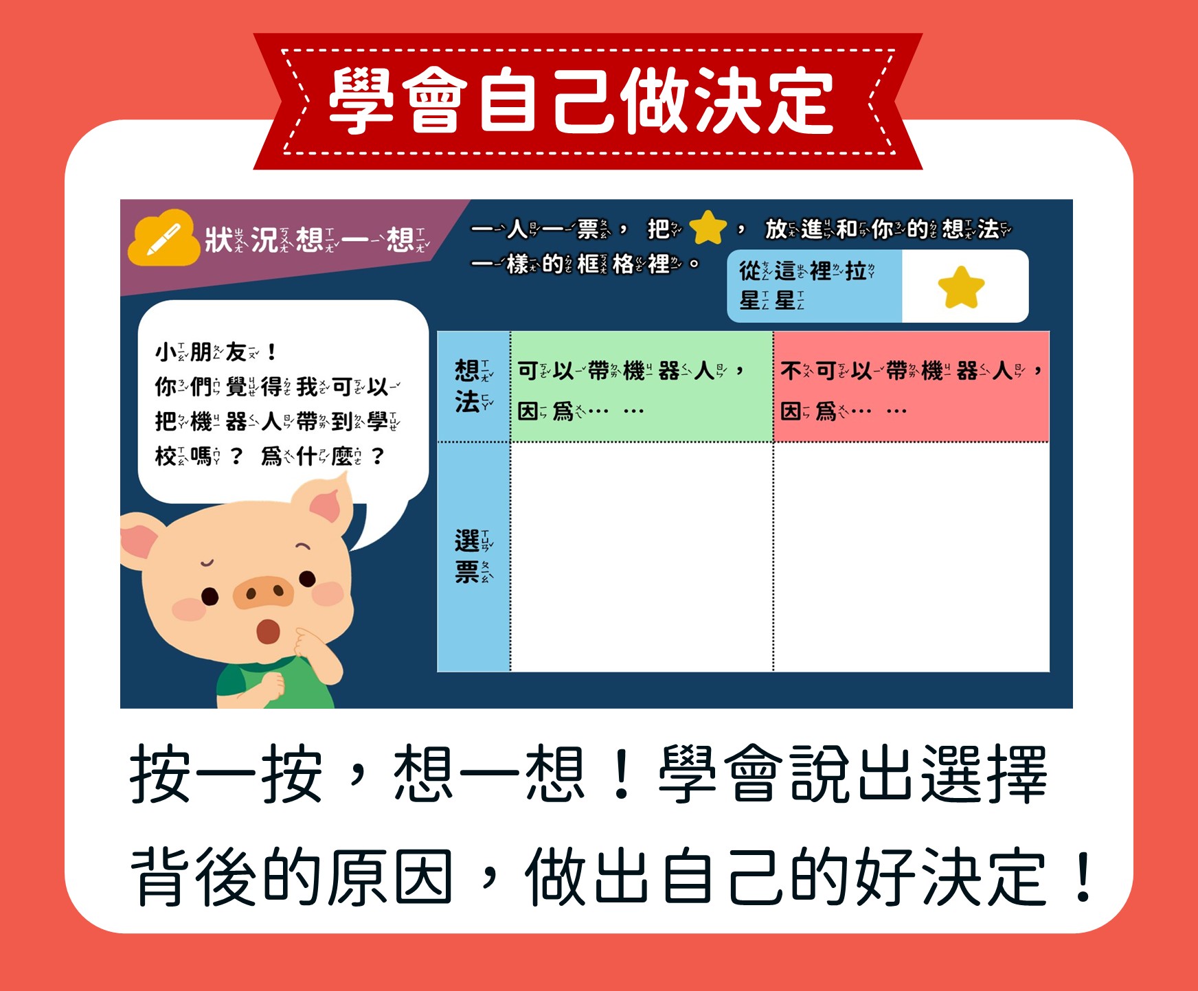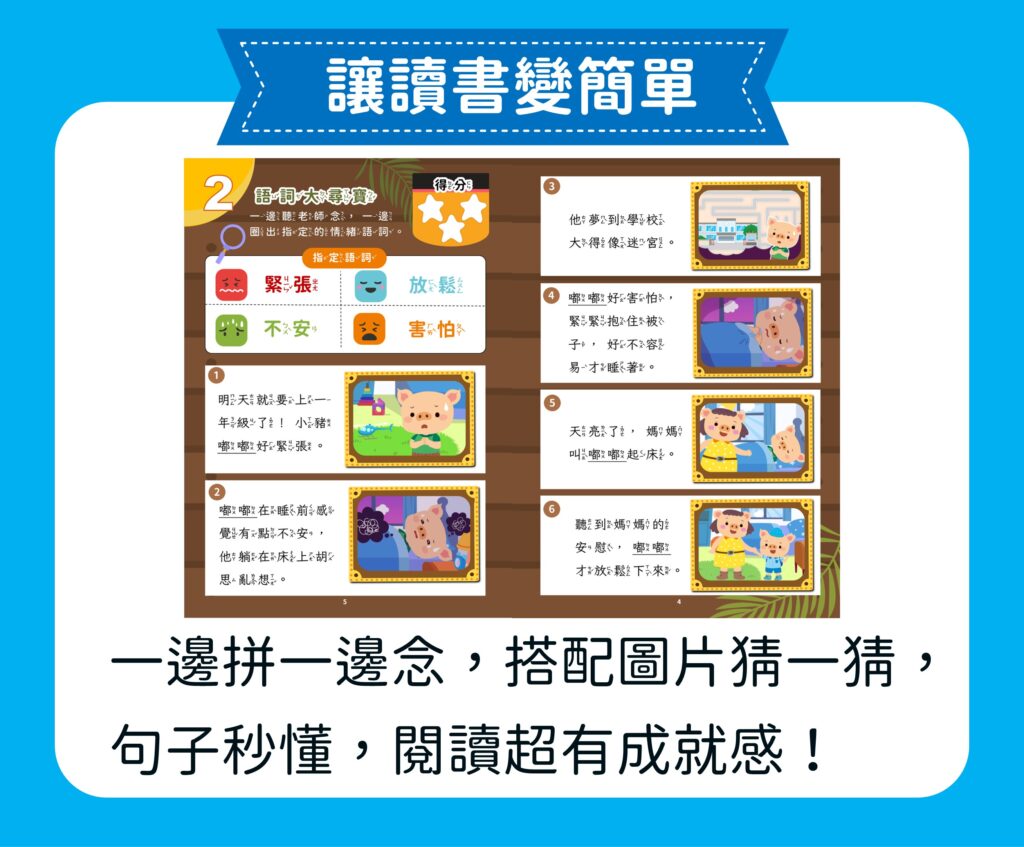 【小豬嘟嘟上學去】單元是專為小一新生設計的閱讀寫作初體驗課程,透過四個貼近生活的小故事,引導孩子說出心情、寫出經驗、練出勇氣,邁出自信學習的第一步!