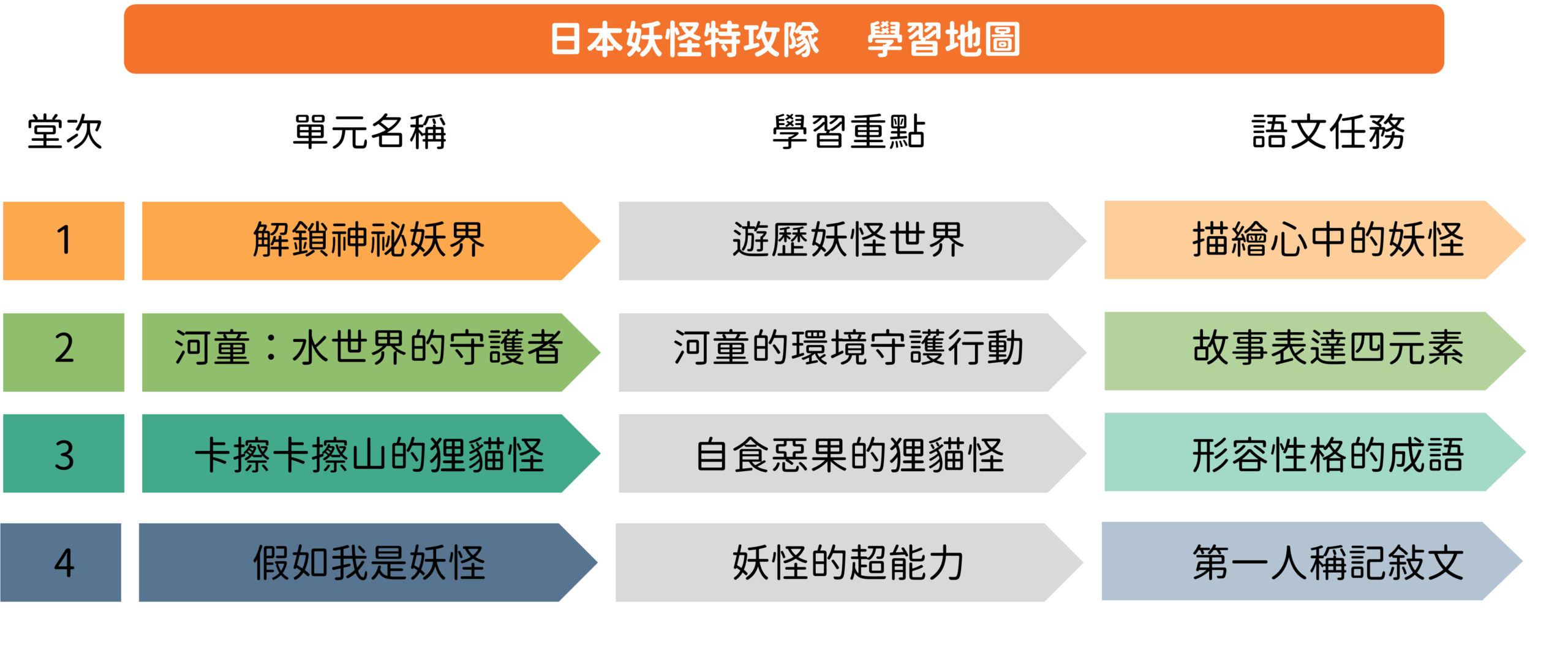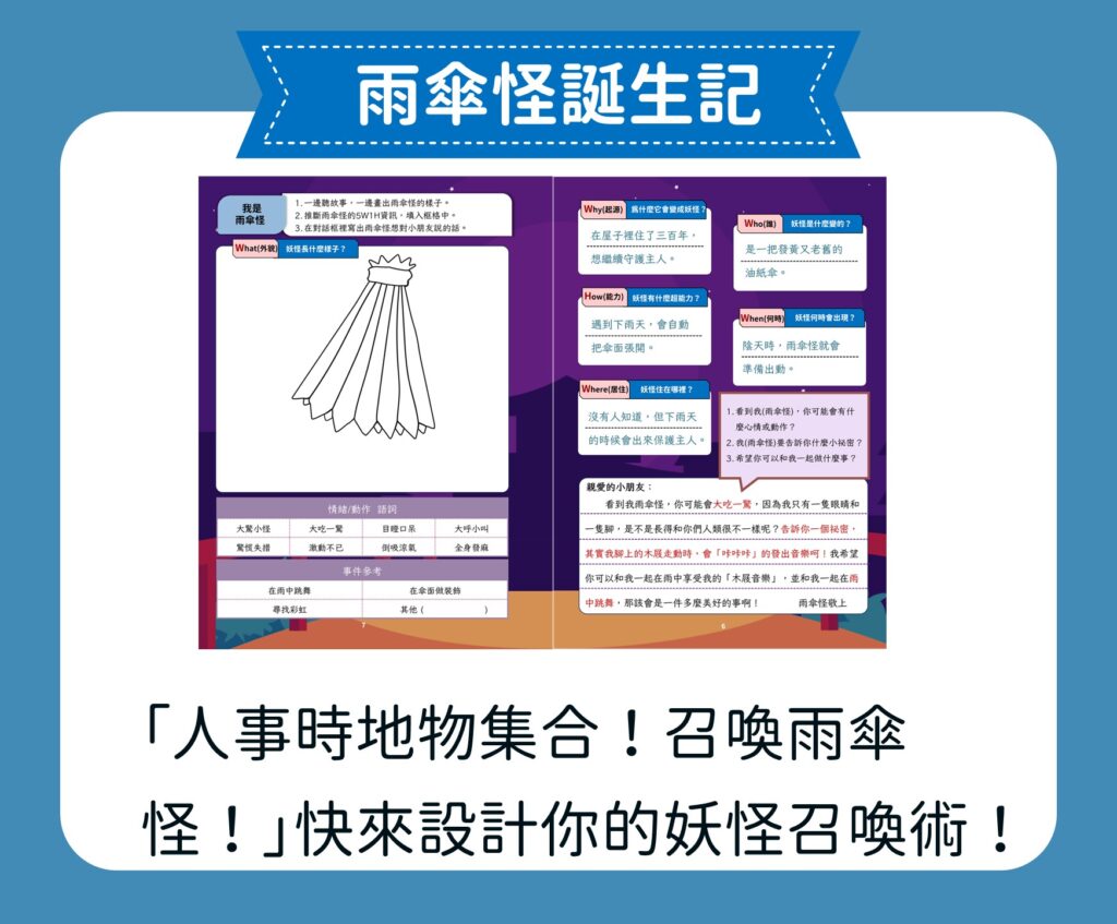 我們運用 5W1H 經典思考法,引導孩子建構完整而立體的妖怪世界,完成奇幻的記敘文體。透過妖怪故事閱讀,讓孩子經驗自然與人類的互動,也在潛移默化中學會了成語,無痛提升語文力。這是一堂結合想像力與寫作力的課程,讓孩子創作出獨特而生動妖怪世界。