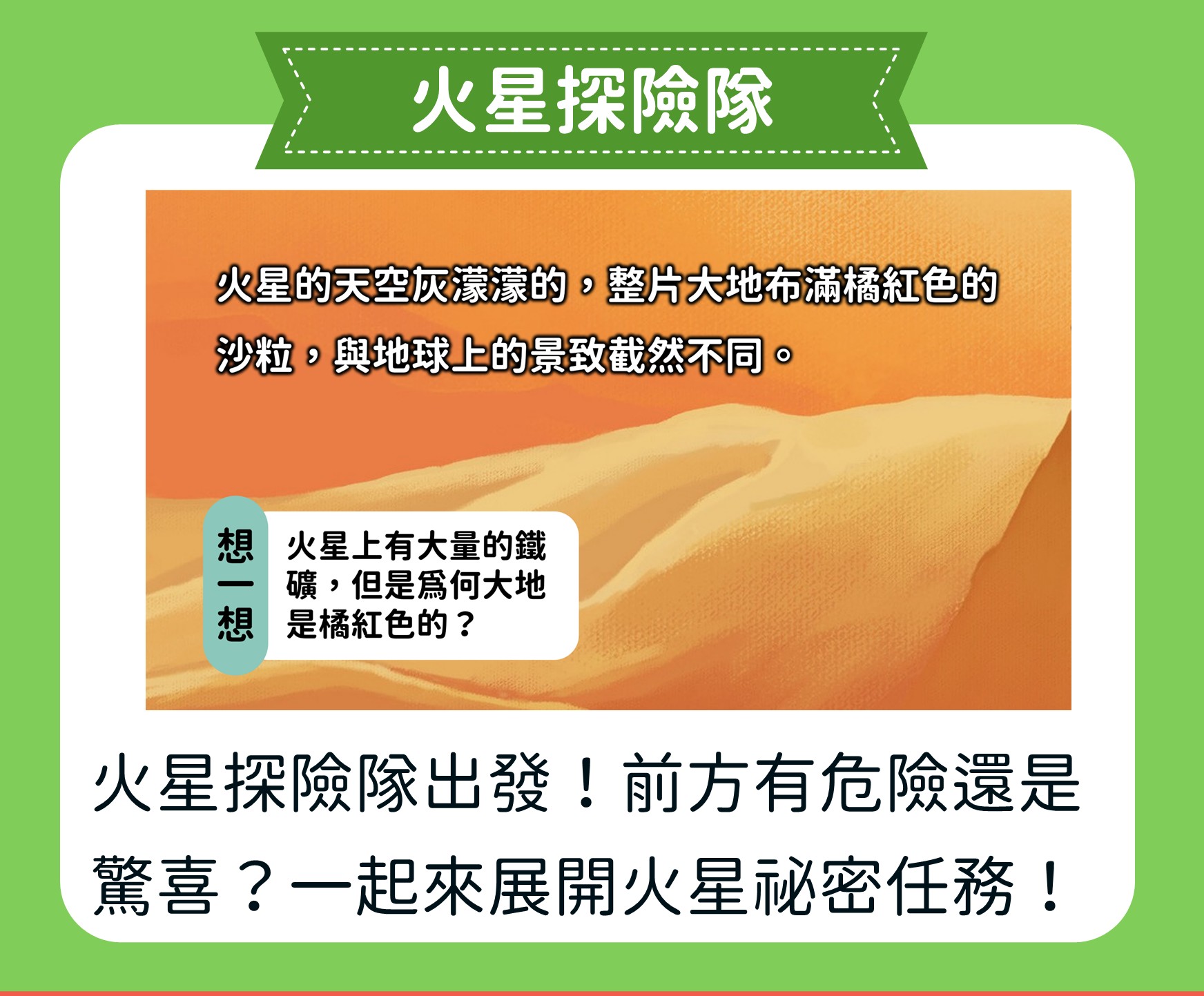 【太空探險 × 科學寫作 】從探索太空人的生活出發,帶孩子認識八大行星、挑戰火星探險,最後還能與外星人「相遇」!課程中結合科普知識與語文創作,孩子將透過任務報告與想像書寫,提升觀察力與表達力,開啟屬於自己的宇宙冒險。