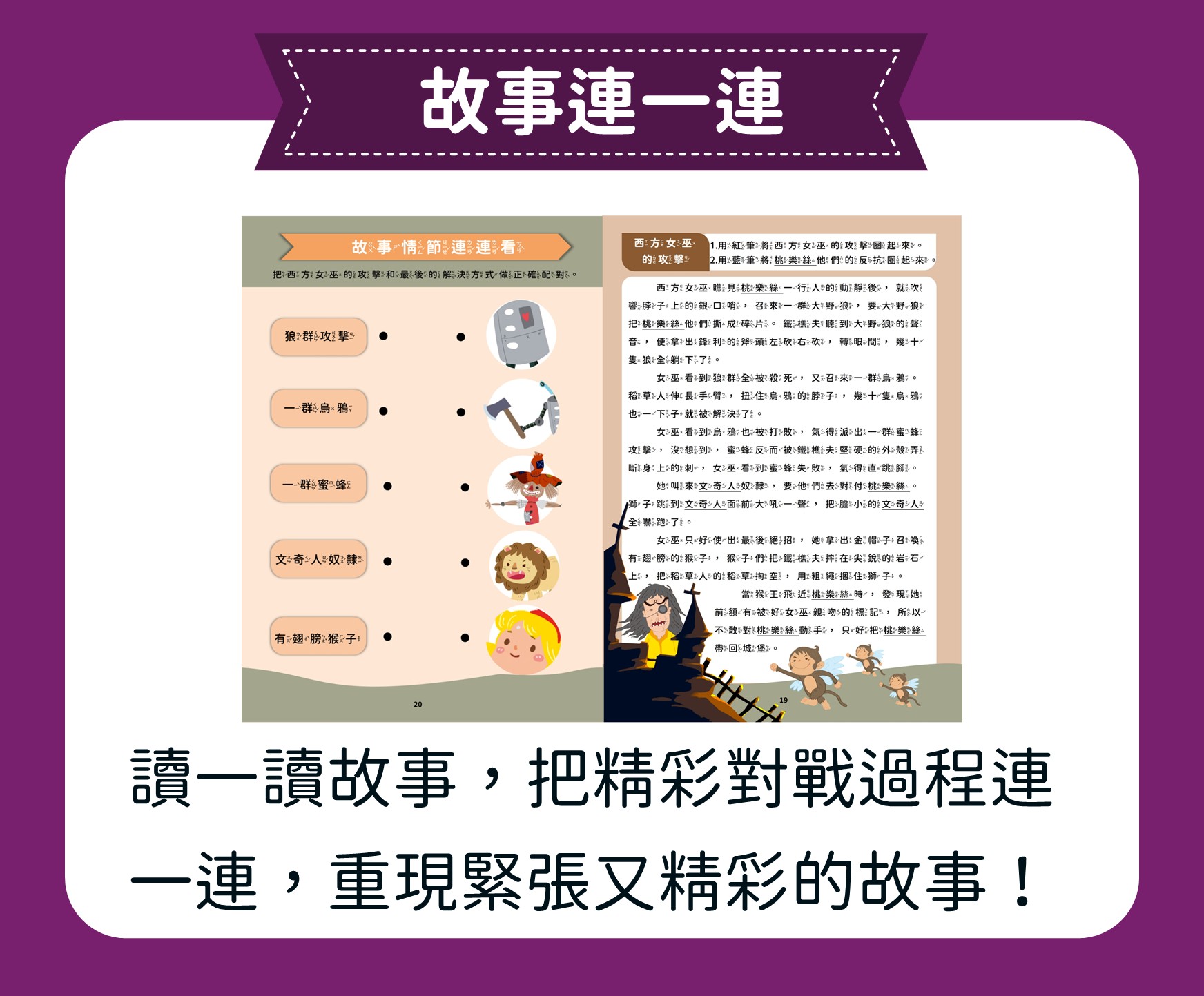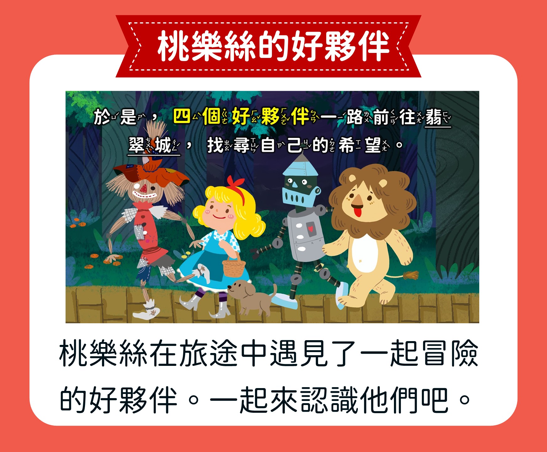 跟著桃樂絲與她的夥伴踏上奇幻的冒險旅程,一起去尋找智慧、愛與勇氣。透過經典閱讀,讓孩子認識團結與友情的可貴,也學習如何表達願望、面對挑戰。
