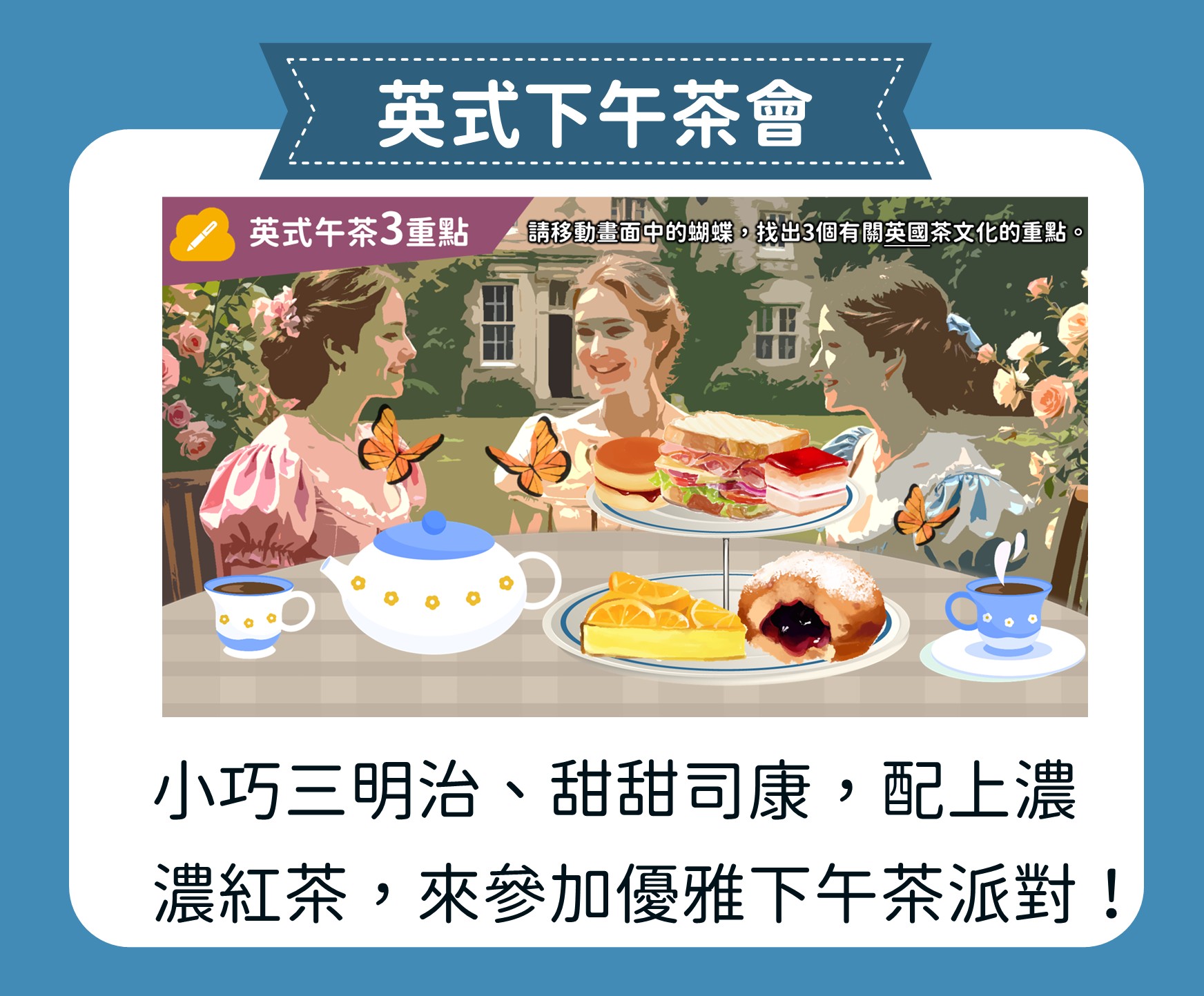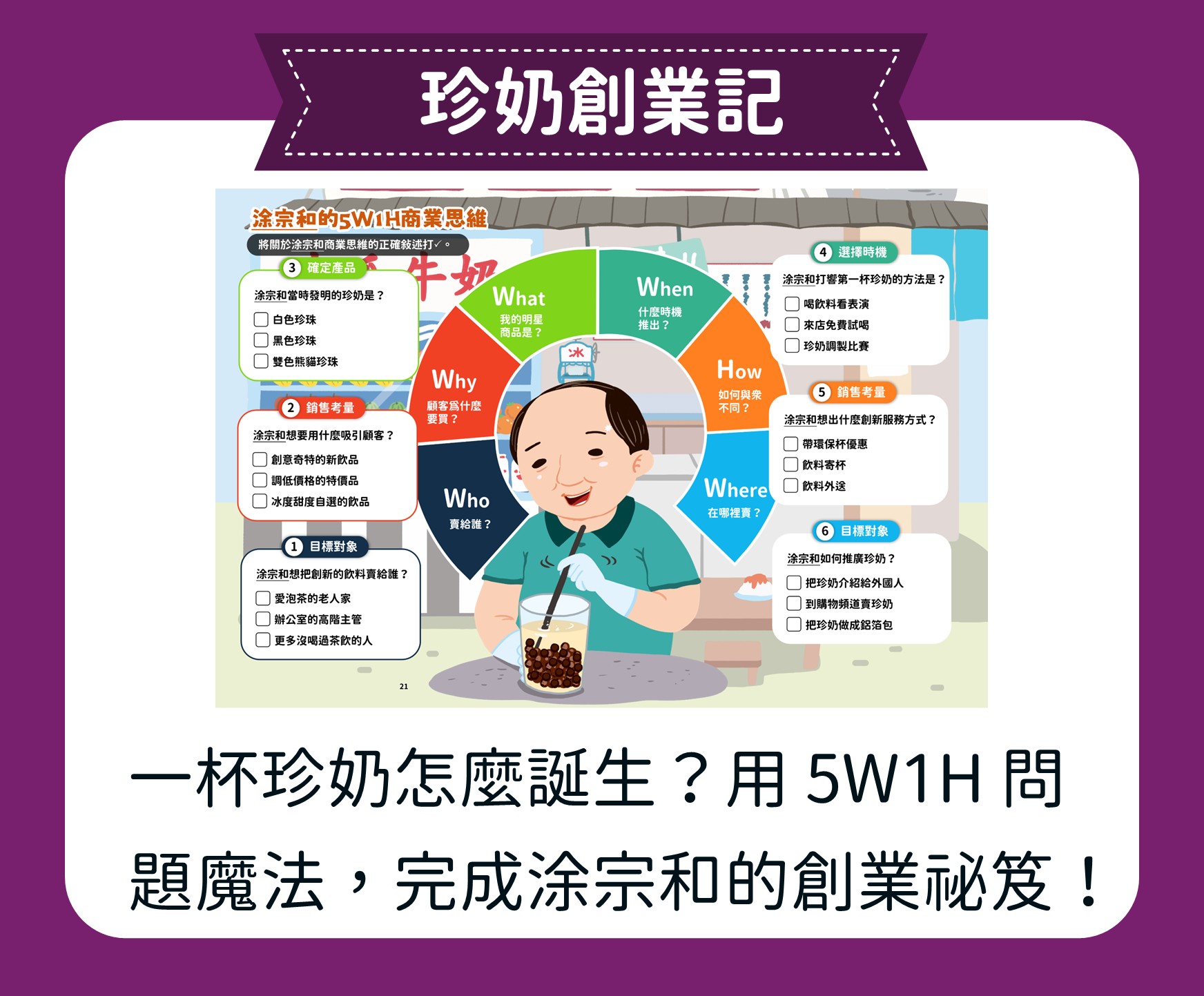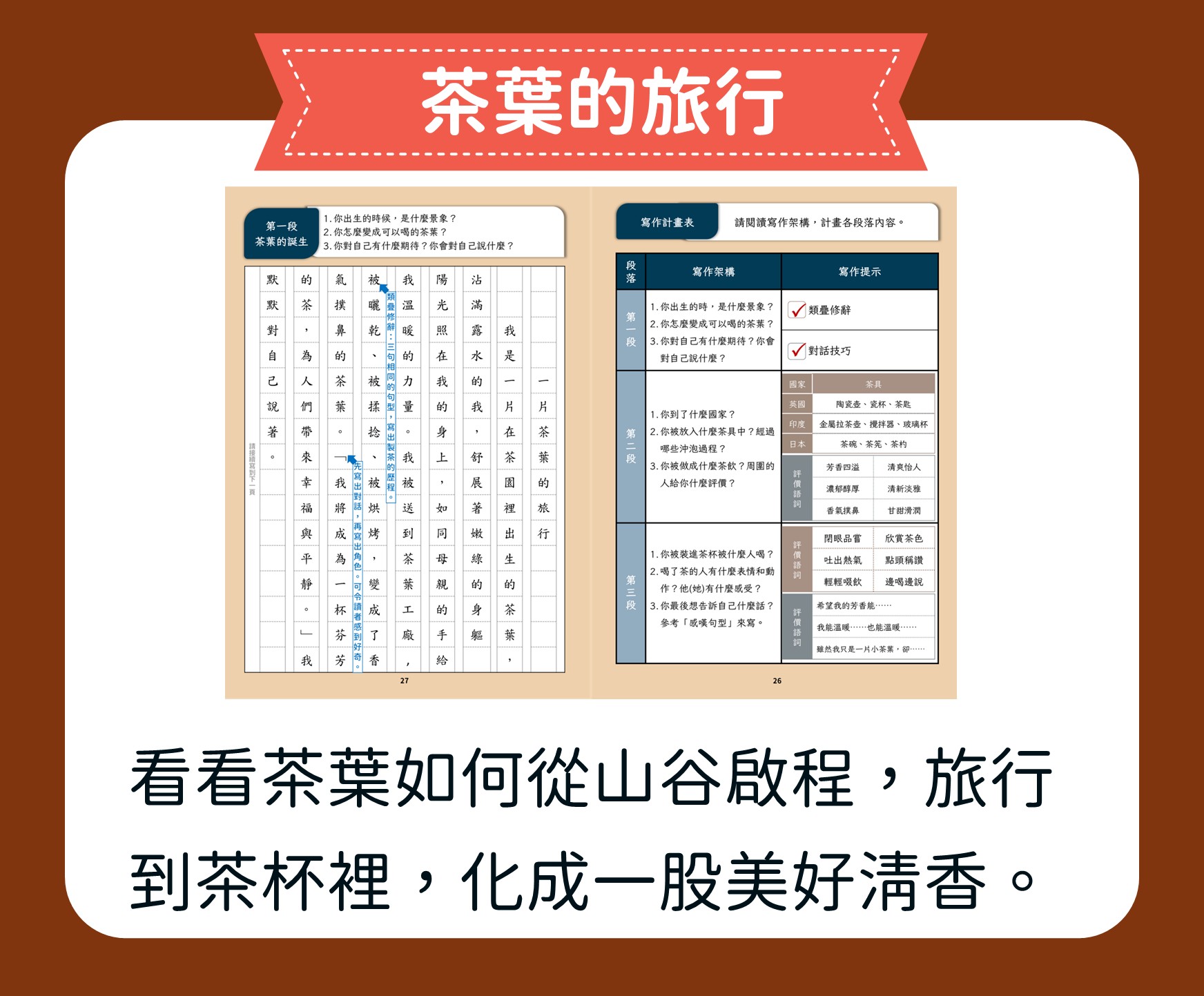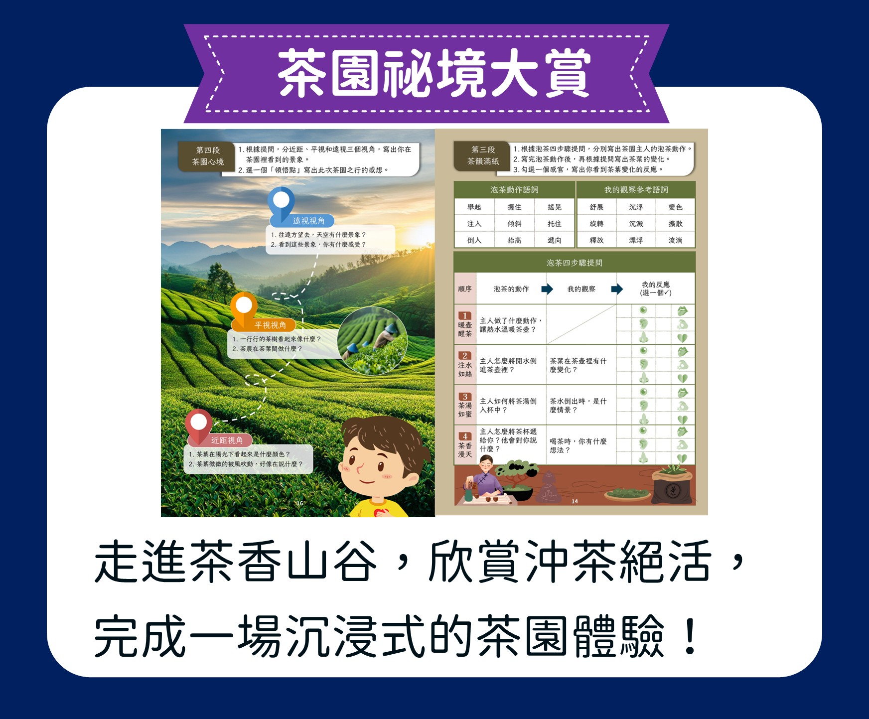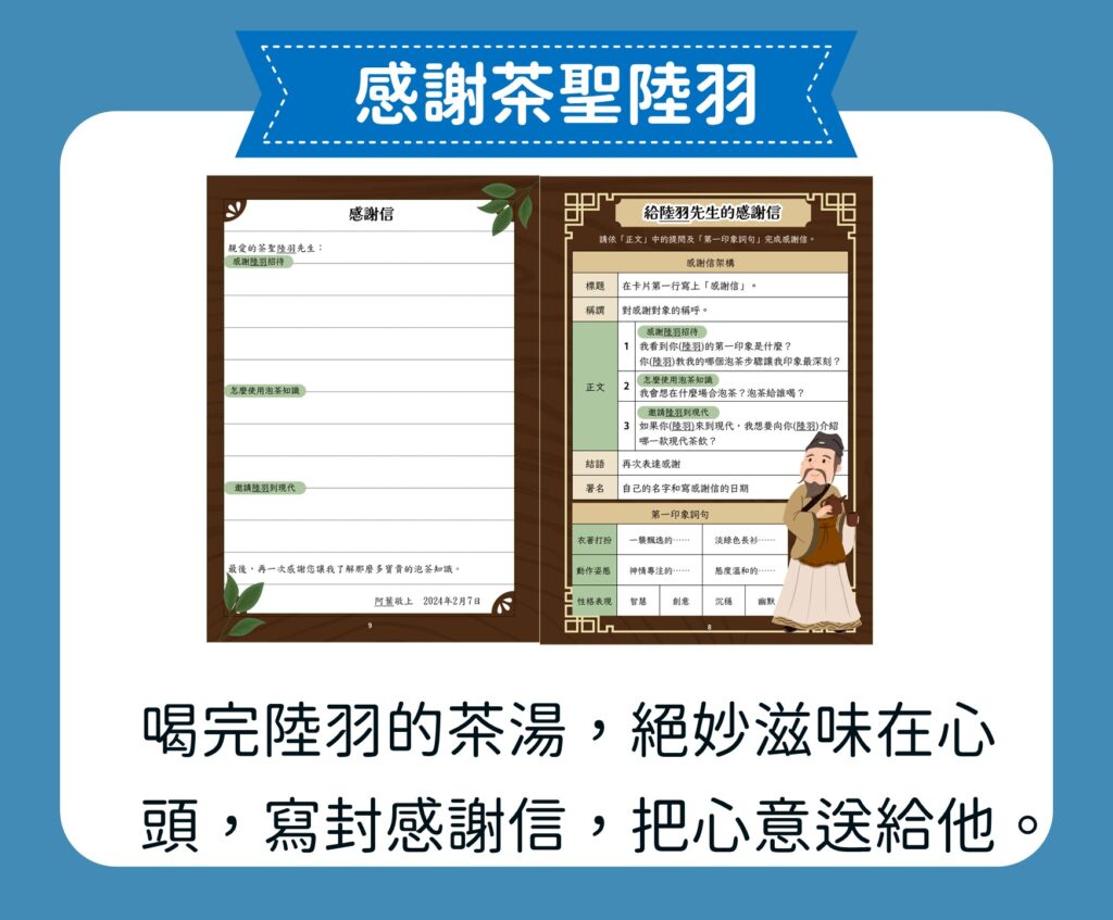 【茶香千年:從唐風茶聖到珍奶傳奇】 我們帶孩子回到唐代,拜訪茶聖陸羽,認識茶文化的源頭;走進高山茶園,浸潤在滿山茶香;回到城市,品味珍奶的創新風貌。最後,從東方走向世界,欣賞多元的茶文化。這是一場知性與想像交織的茶香之旅,透過 5W1H 的引導,孩子將寫下屬於自己的茶故事。