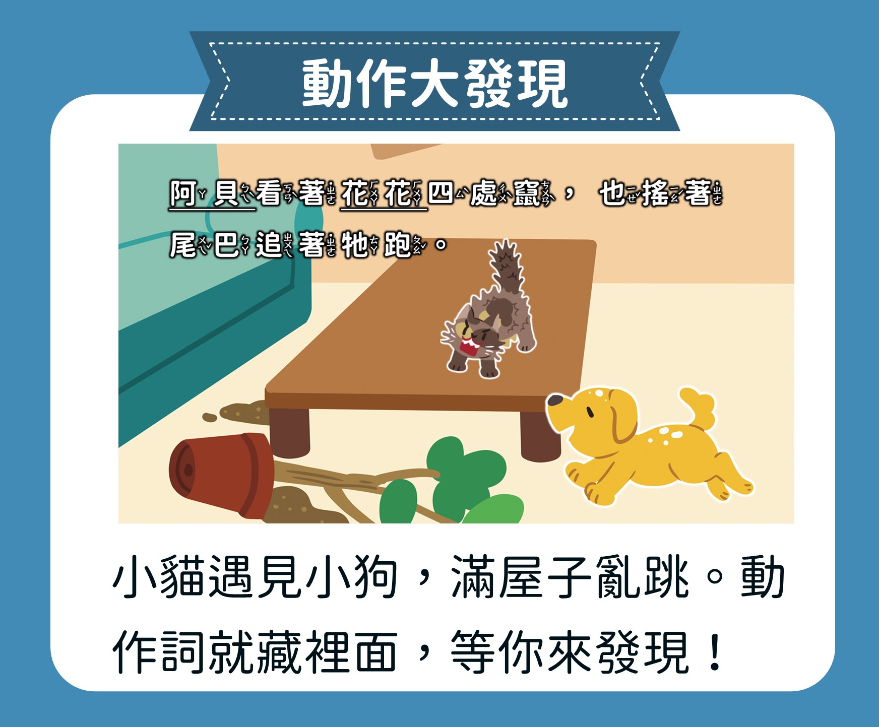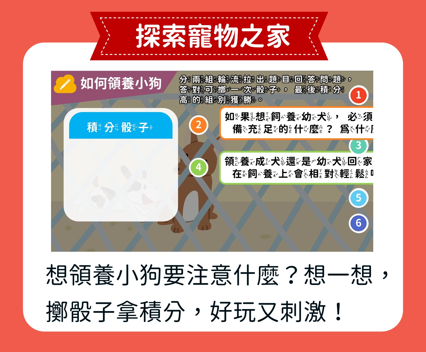 孩子將跟著阿寶、小葵與寵物們,一起接受飼養寵物的挑戰與責任,學習尊重生命,並練習表達對生命的理解與關懷。